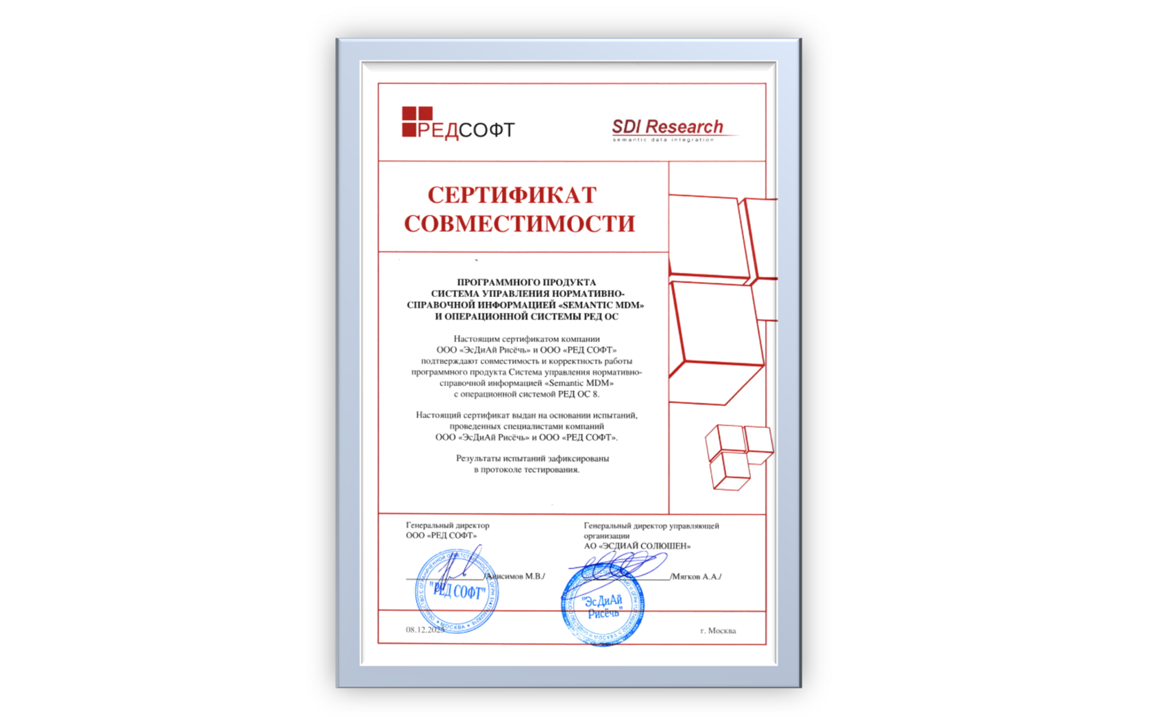 8 декабря 2025 года компания ООО «ЭсДиАй Рисёчь» (разработчик Системы управления нормативно-справочной информацией «Semantic MDM») при непосредственном участии сотрудников компании ООО «РЕД СОФТ» (разработчик отечественной операционной системы РЕД ОС) провела повторные испытания совместимости программного продукта «Semantic MDM» и операционной системы РЕД ОС актуальных версий. По результатам успешных испытаний получен сертификат соответствия.